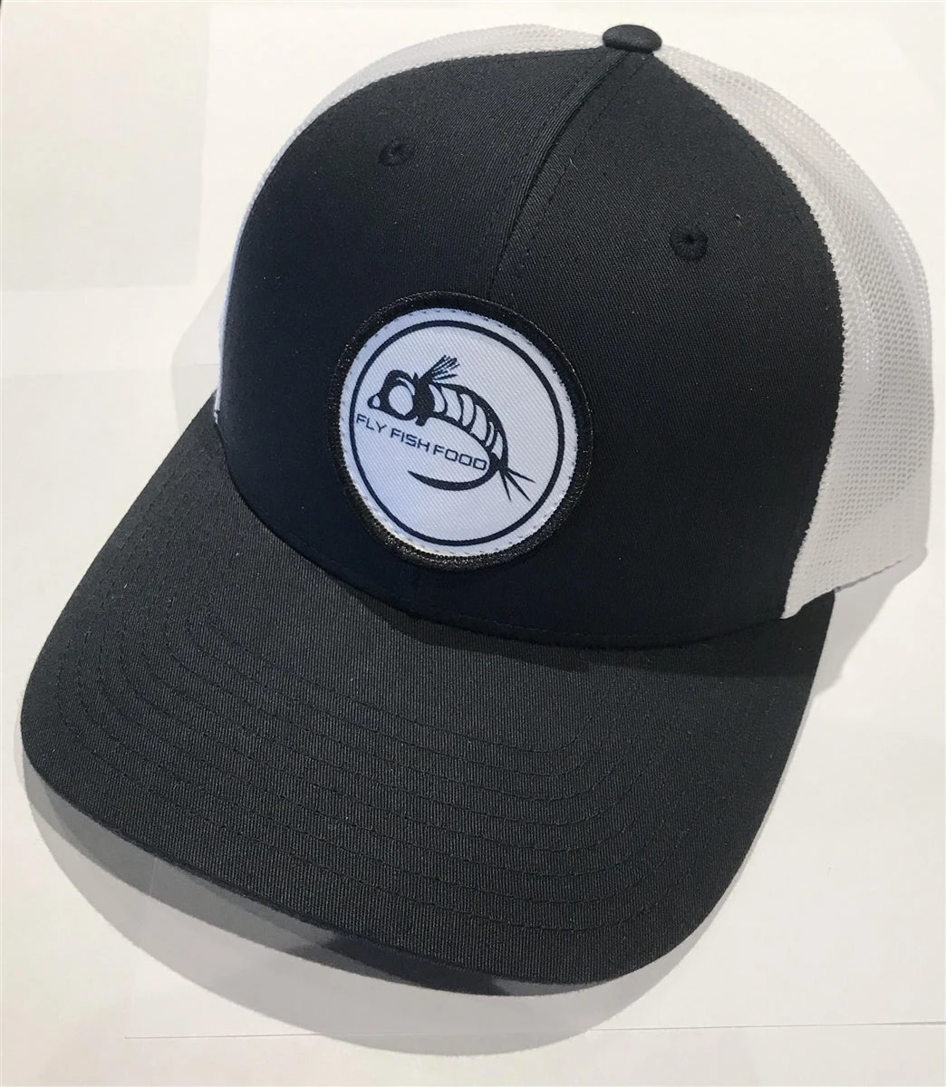Snap back hat with a simple Fly Fish Food logo. Black with White Mesh. 1 size fits all.