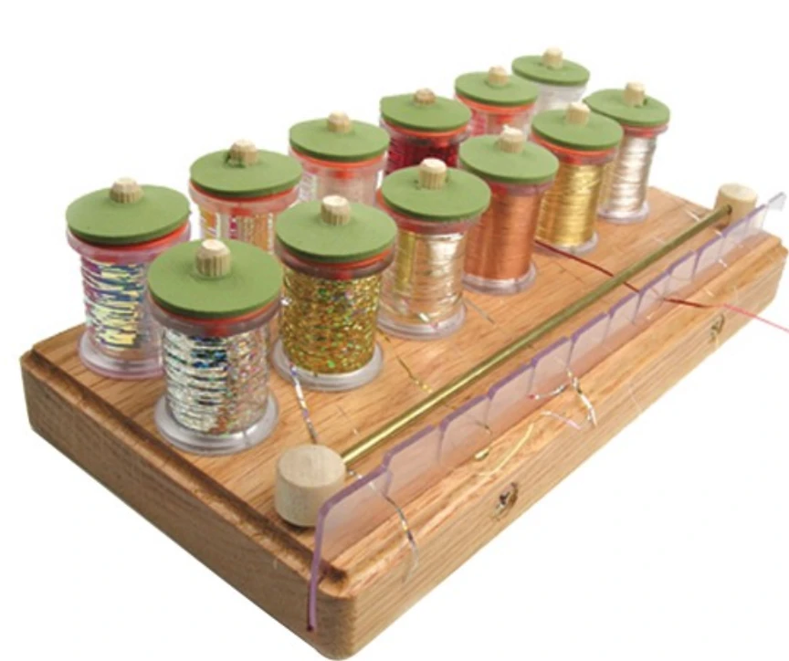 The Rib Runner is a unique tinsel and wire dispenser that maintains constant tension on the spools to virtually eliminate tangles or wasted material. Holds 12 spools.