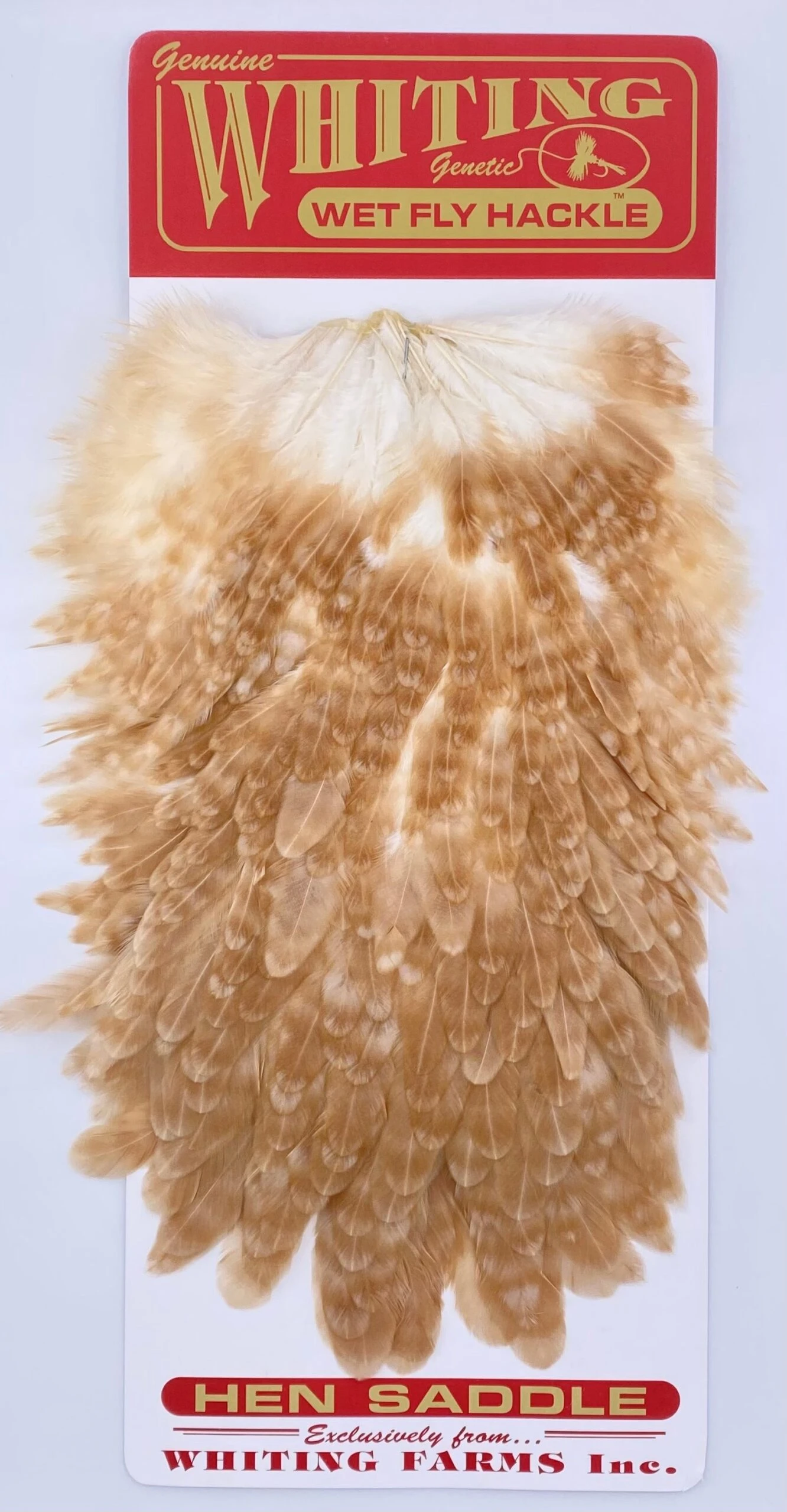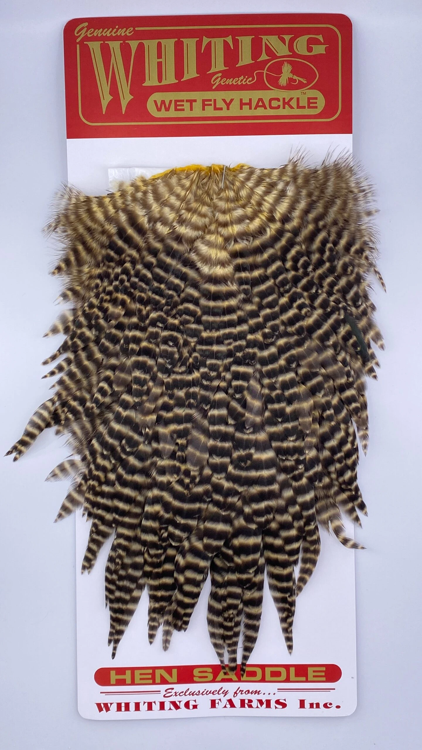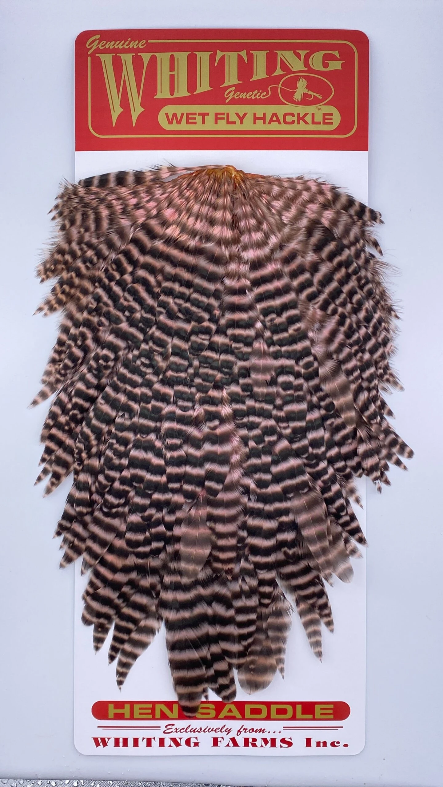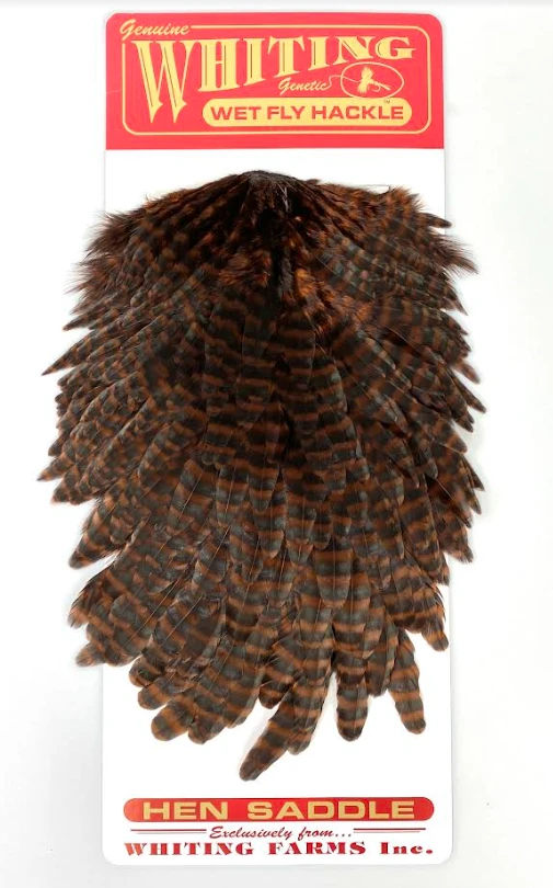 Whiting Red Label Hen Saddle. This is a great soft hackle material. The length of the overall feathers is relatively long because they are the hens from the red label line. Also good on streamers.
