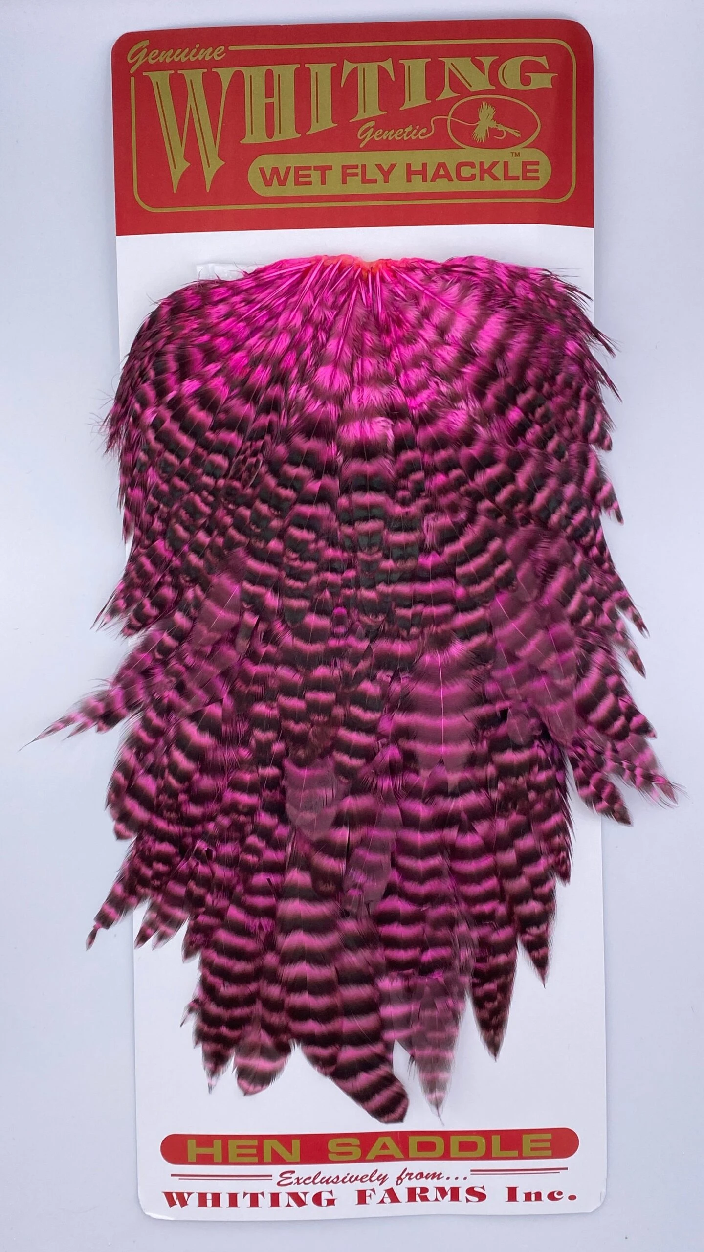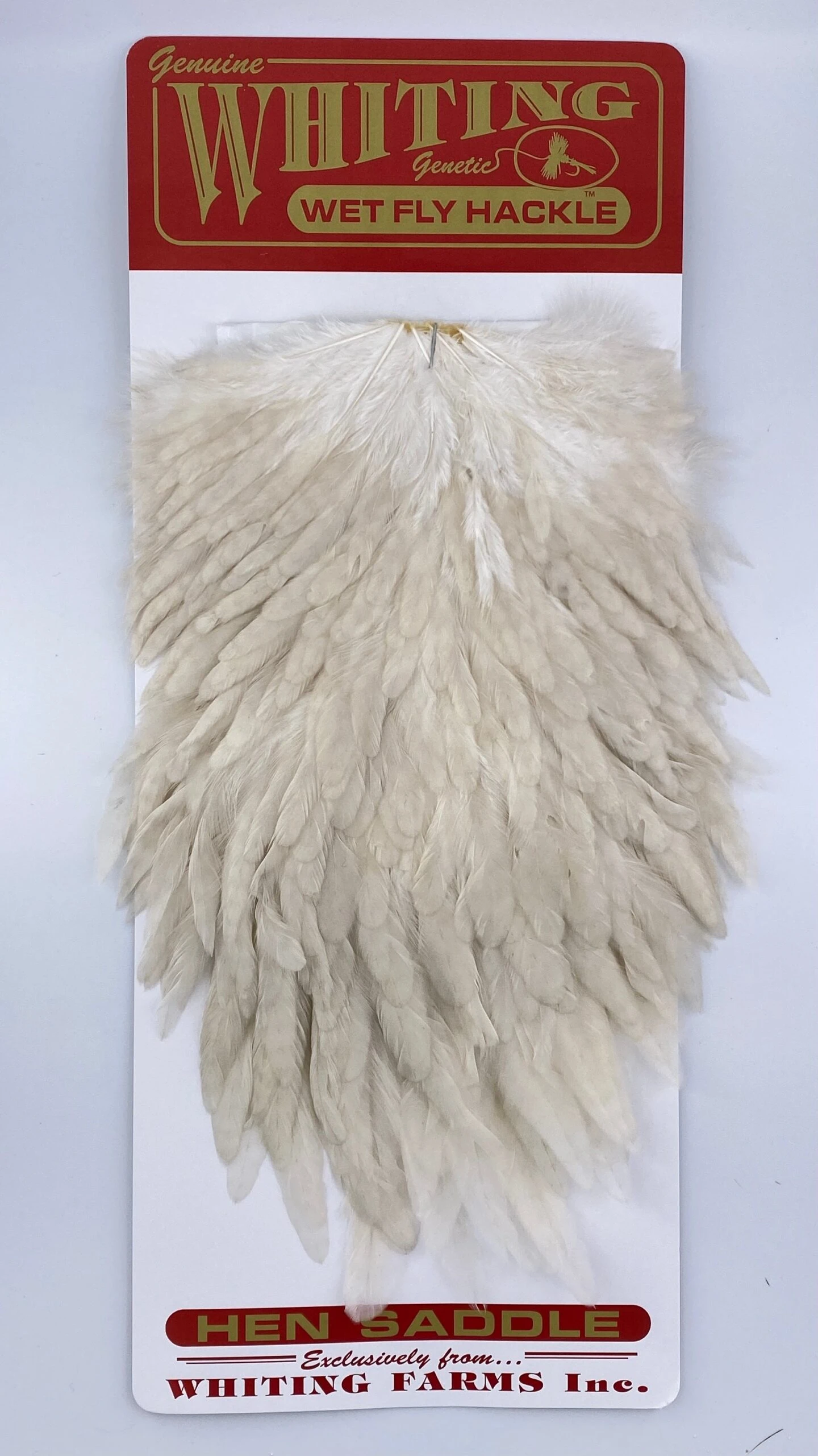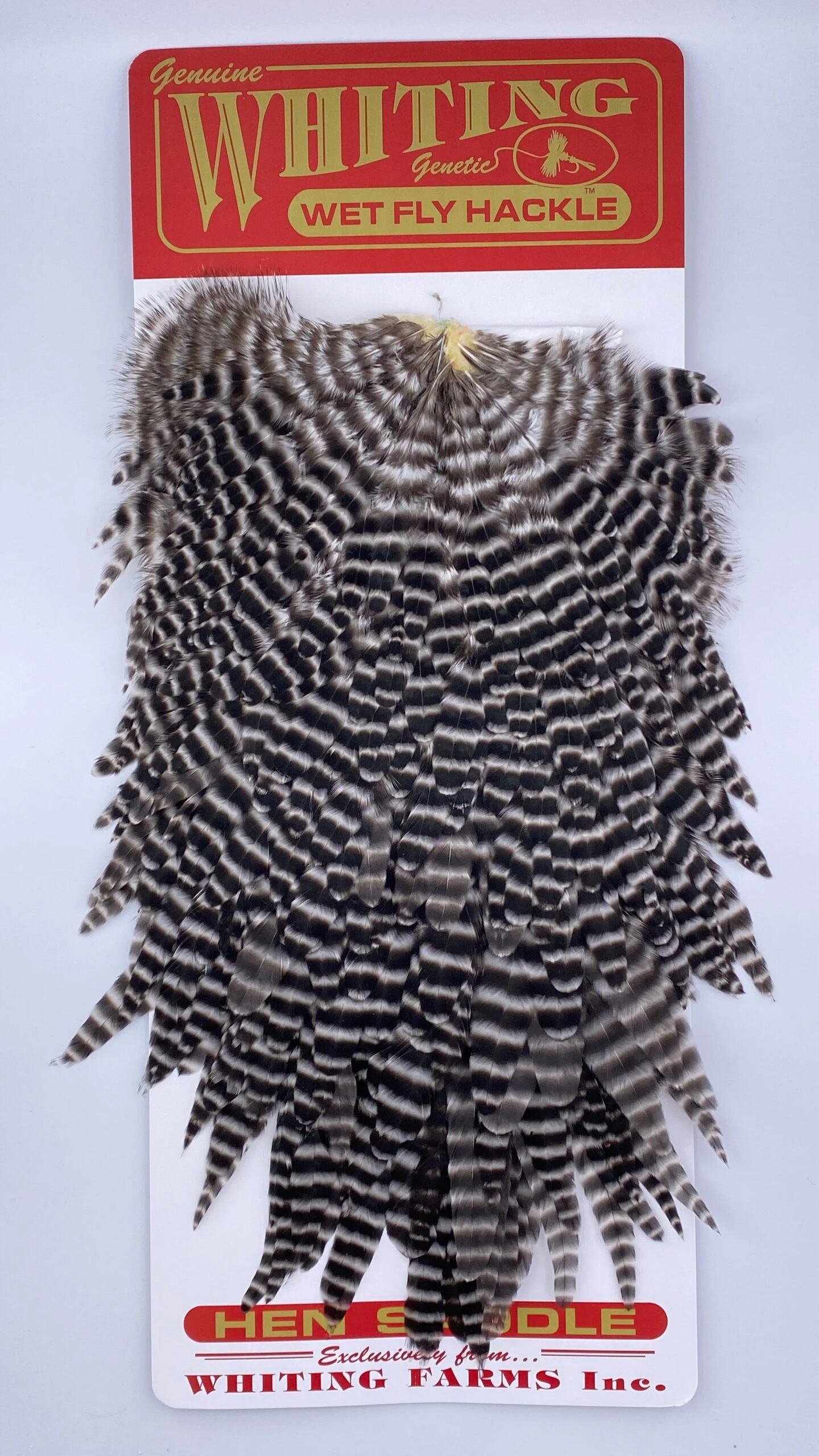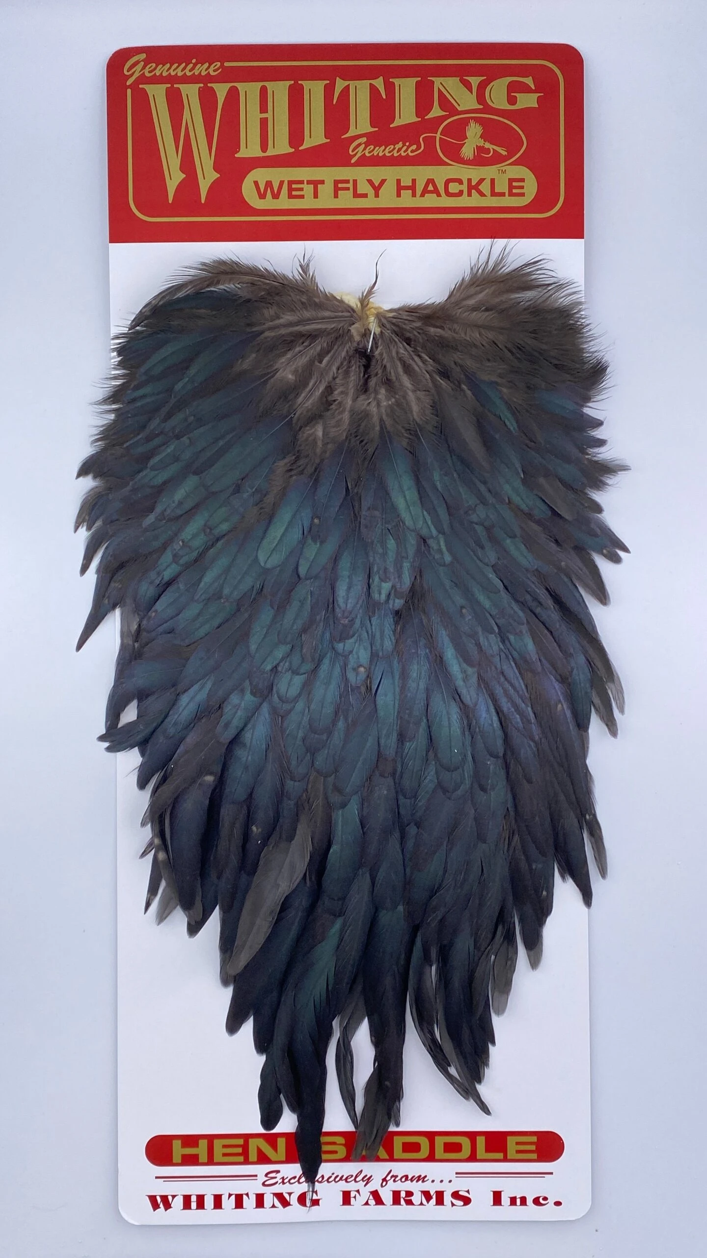Whiting Red Label Hen Saddle. This is a great soft hackle material. The length of the overall feathers is relatively long because they are the hens from the red label line. Also good on streamers.